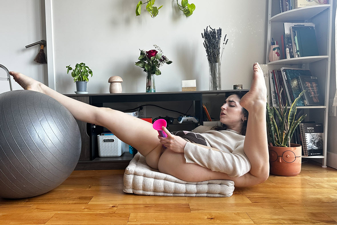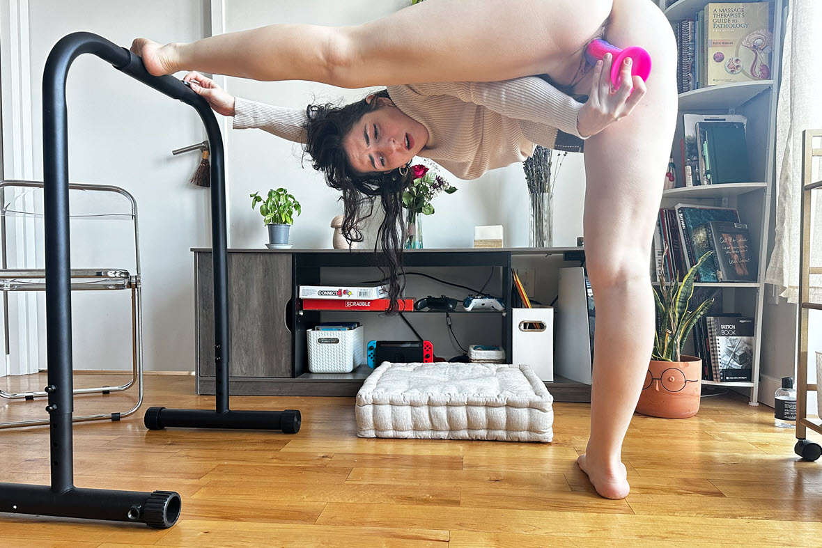 Natasha is here to combine her two great passions, stretching and squirting. In her Ersties’ Advent Calendar daring category entry she’s going to explore squirting in the most daring of positions. She encourages viewers to stretch and warm up their bodies daily to stay flexible and agile, not only in the bedroom but in everyday life too. With her legs stretched behind her head and knickers pulled to the side, Natasha begins to massage her pussy to get her juices flowing. Her fingers circle her clit and before long she’s able to plunge them deep inside. She takes a dildo into her pussy and in the splits rides it. The grand finale? Riding a dildo on a glass table so we can witness her glorious squirt release.